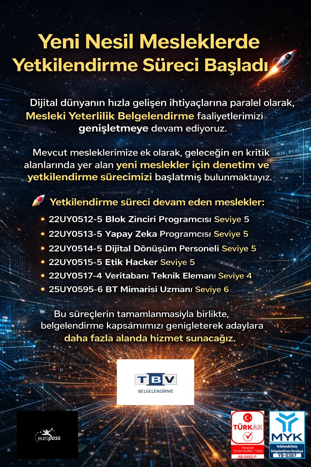 Dijital dönüşümün gerektirdiği yeni nesil meslek alanlarında belgelendirme kapsamımızı genişletiyoruz.